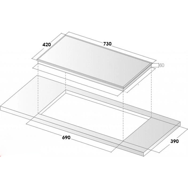 Kích thước hợp lý: mặt kính 730x420mm, khoét đá 680x380mm, phù hợp với đa số gian bếp hiện nay.