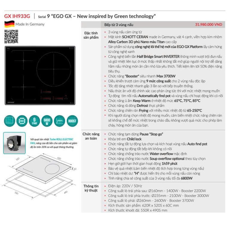 Bếp từ GrandX GX IH933G Series 9 là dòng bếp từ cao cấp nhập khẩu Đức, được trang bị mặt kính SCHOTT CERAN chính hãng, công nghệ biến tần Half Bridge Smart Inverter và bộ mâm từ EGO GX Platform thế hệ mới – mang lại hiệu suất nấu vượt trội, tiết kiệm điện tối đa và độ bền cao.