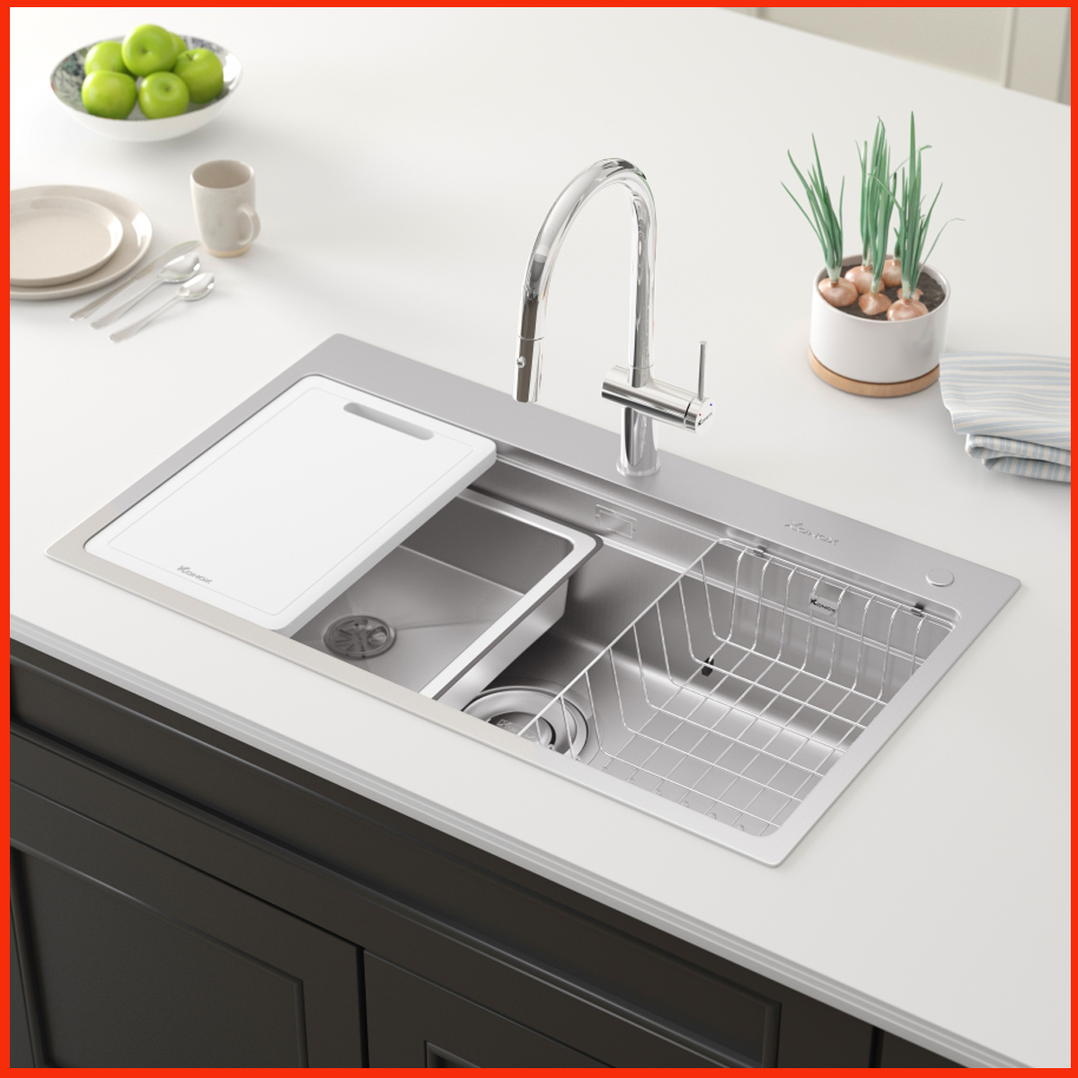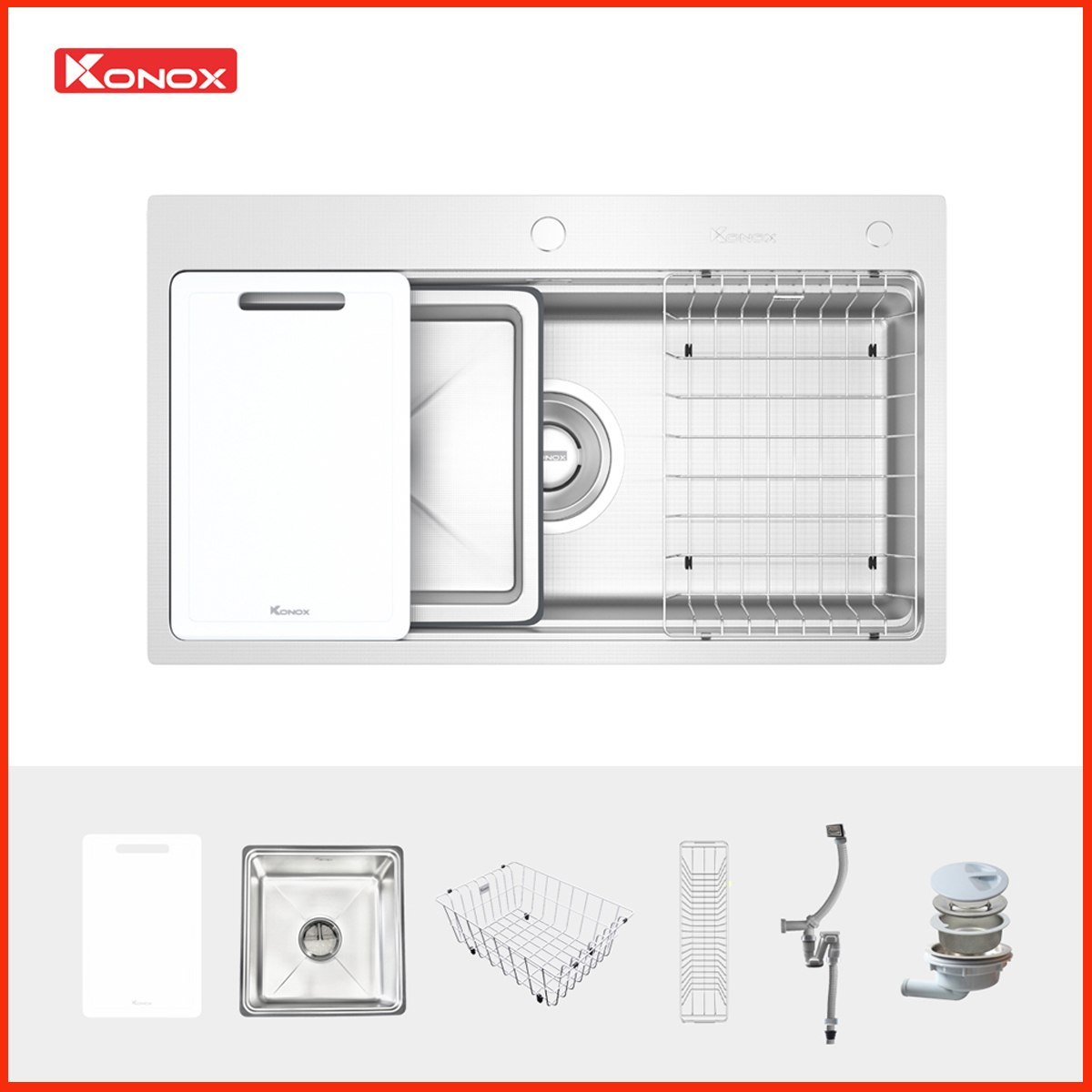 Tích hợp bộ phụ kiện đa năng: Gồm thớt nhựa, rổ phụ, colander, giá úp – biến chậu rửa thành trạm sơ chế thực phẩm chuyên nghiệp.