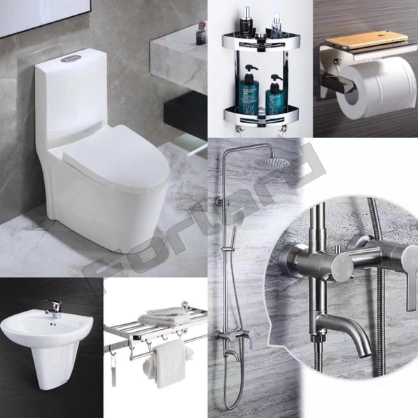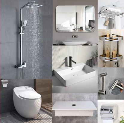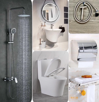 - Bộ sản phẩm bao gồm 10 món: Bồn cầu, sen tắm đứng, chậu rửa mặt, bàn đá, gương, vắt khăn, kệ góc, xịt vệ sinh, vòi rửa mặt nóng lạnh, lô giấy kín.