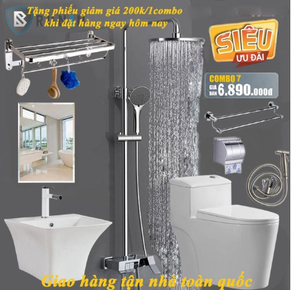 - Combo cao cấp có 6 món: Bồn cầu liền khối, sen tắm, chậu rửa mặt, giàn vắt, lô giấy, kệ góc.