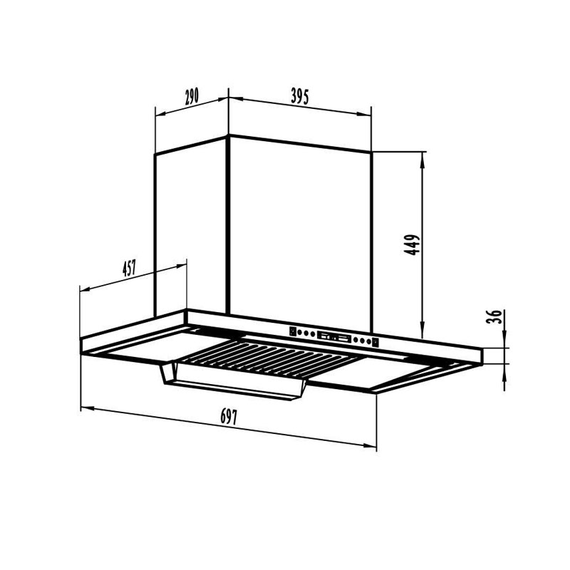 Với kiểu dáng máy chữ T gắn tường sâu 450mm, thiết bị không chỉ tiết kiệm diện tích mà còn đảm bảo khả năng khử mùi tối ưu, giúp không gian bếp luôn trong lành, sạch sẽ và hiện đại.